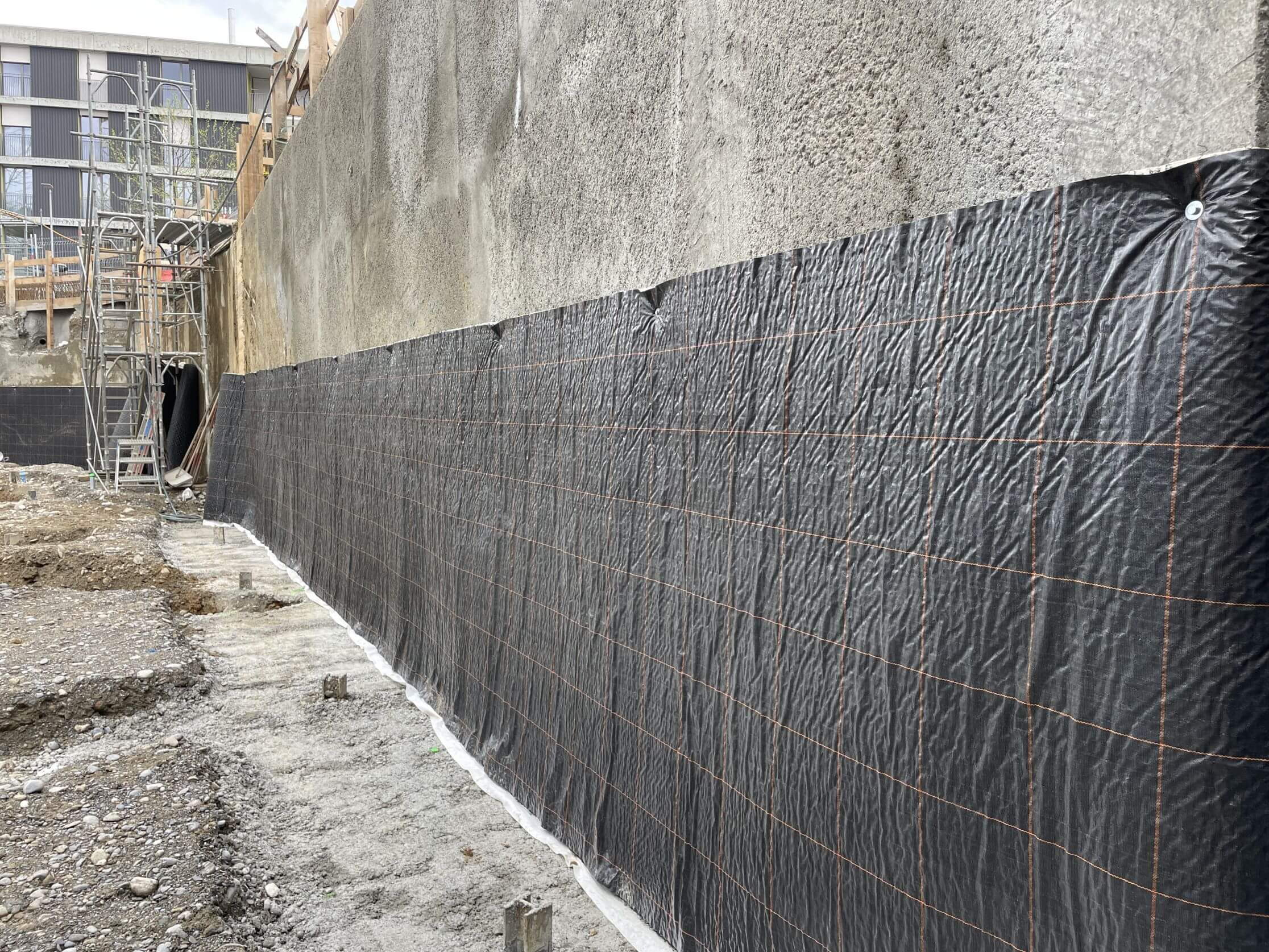 Lors de la construction d'un immeuble résidentiel et commercial de cinq étages à Köniz, il était nécessaire de protéger durablement les caves contre l'infiltration d'eau. Cet objectif a été atteint grâce à la natte de coffrage et de drainage SYTECDRAIN MDF 700 de SYTEC. Le produit est composé d'une membrane robuste avec des joints collés, d'un noyau de drainage de 20 mm d'épaisseur flexible et d'un géotextile filtrant.
