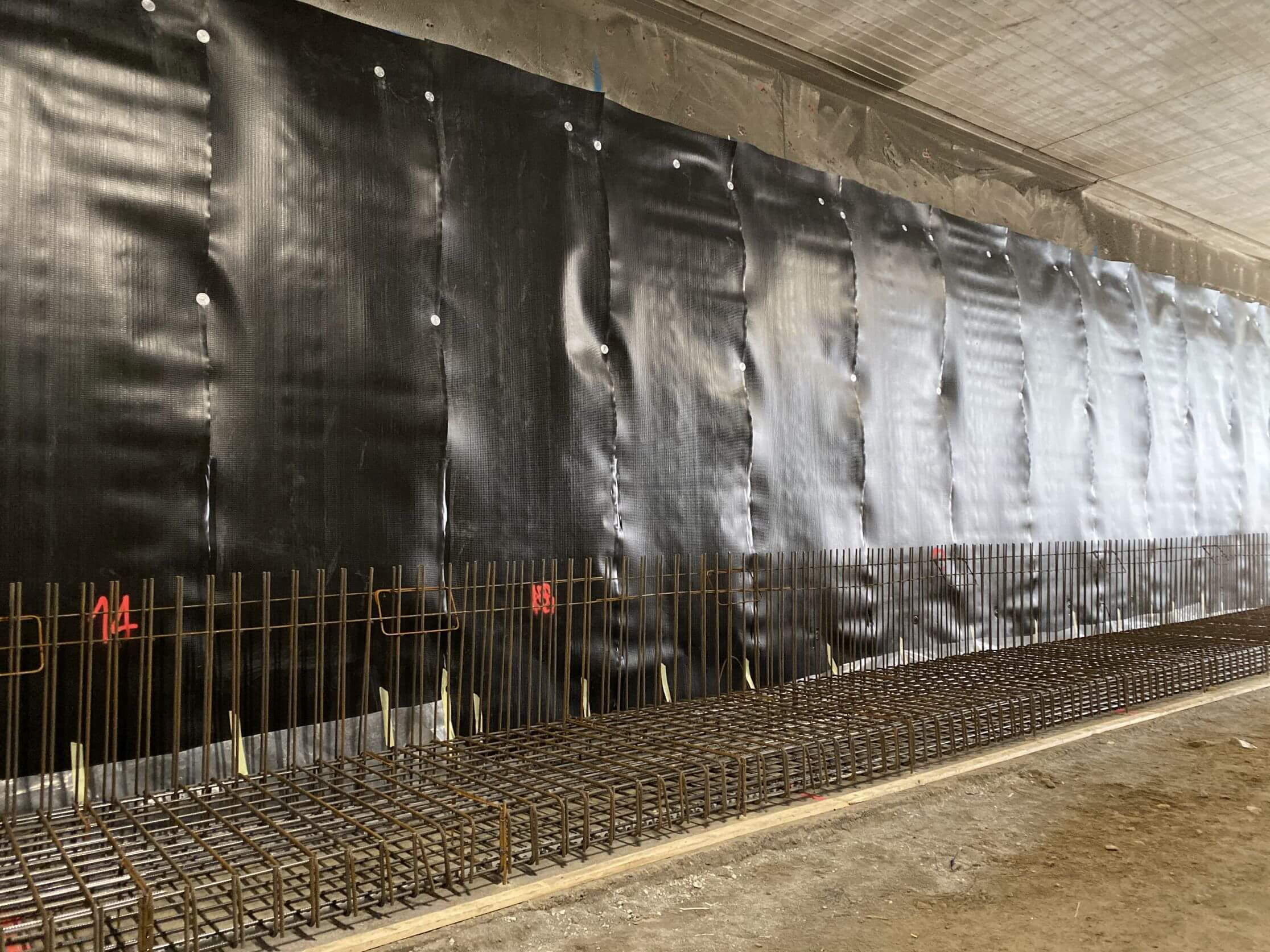 Le coffrage et la natte de drainage haute performance se composent d'un géotextile filtrant, d'un noyau de drainage et d'une robuste membrane en PEHD. Après avoir excavé le sol entre les deux parois de pieux sécants de 1,0 m de diamètre, une couche de béton projeté a été appliquée comme couche de réglage, avant de procéder à l'installation de la natte de drainage SYTECDRAIN MDP. Le système a été mis en place de la manière suivante : Le non-tissé contre le béton projeté. De cette façon, l'eau qui s'écoule le long de la paroi verticale peut être drainée. La membrane HDPE à fonction de coffrage "perdu", en revanche, est restée sur la face interne. Les travaux de génie civil à l'intérieur des deux structures ont été complétés par la pose de l'armature puis le bétonnage des murs avec du béton auto-plaçant (SCC). Pour éviter que le béton SCC ne pénètre dans le noyau de drainage, les joints ont été soigneusement scellés avec du ruban adhésif SYTEC Splicer et les bords avec un profilé galvanisé et une bande de néoprène.