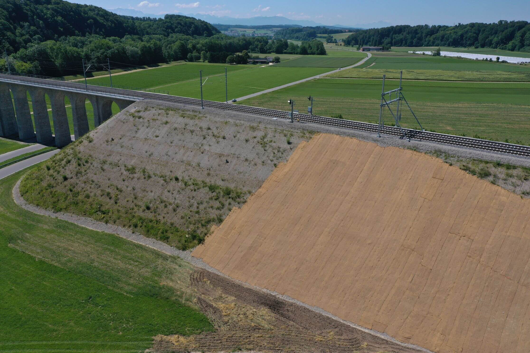Dans le cadre du doublement de la voie du viaduc (qui existe déjà depuis 120 ans), la digue est en cours d'élargissement. Pour protéger les talus de l'érosion, ils ont été recouvert avec la natte de coco SYTEC K-Tex. A moyen terme, le remblai sera végétalisé et la protection contre l'érosion sera assurée par l'enracinement. La natte de coco se décompose au bout de 3 à 6 ans (en fonction de l'application de la natte et de l'exposition aux intempéries).