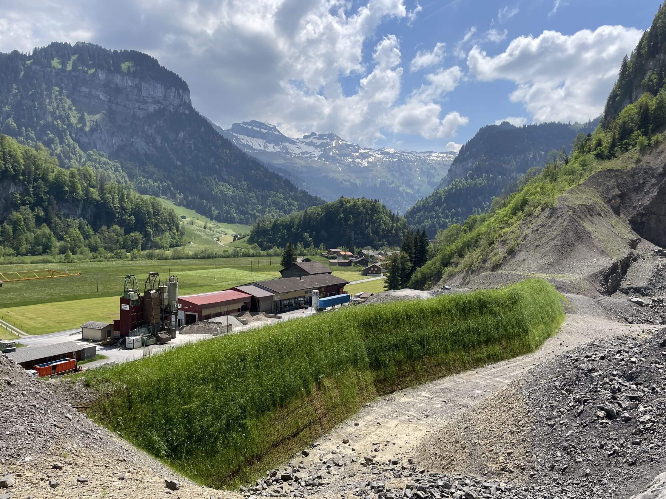 Un digue de protection, d’une longueur de 120 mètres et d’une hauteur de 8 mètres, a été réalisée à partir du système « TerraMur2 » de SYTEC. Cette dernière a été construite sur un talus d’une hauteur de 10 mètres et renforcé par le système « TerraStop ». Ces deux systèmes en terrain armé présentent de réels avantages : le matériau de construction est issu en grande partie des matériaux d’excavation présents sur place, garantissant ainsi une grande durabilité et un niveau de rentabilité très intéressant. Une fois terminés, les parements des deux constructions ont pu être végétalisés, ce qui permettra à l’avenir à l’ouvrage de protection de passer presque inaperçu dans le paysage.