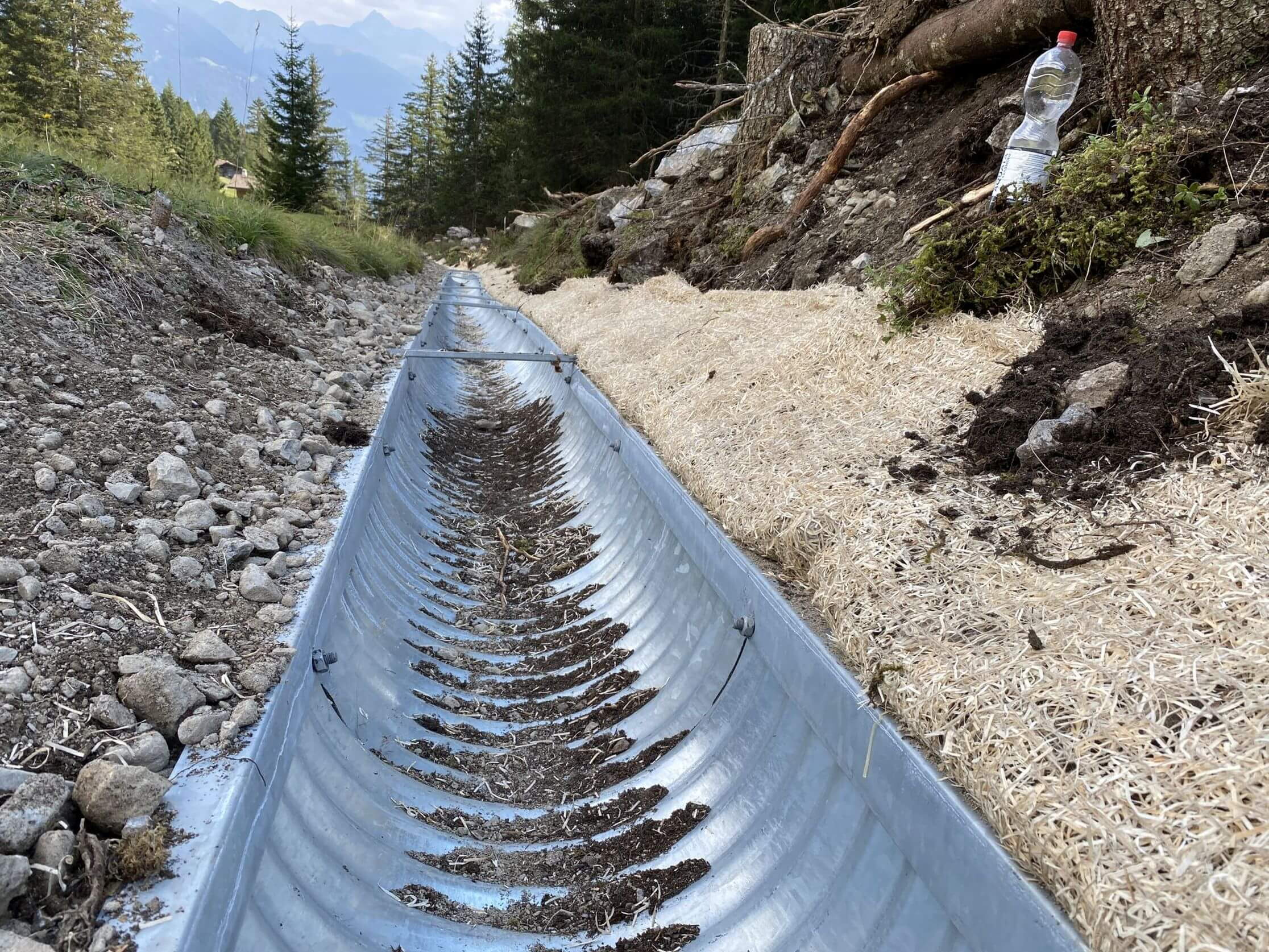 La commune de Brienz fait toujours la une des journaux à cause des glissements de terrain. La montagne continue de glisser et un glissement de terrain n'est pas à exclure. C'est pourquoi le canton des Grisons a décidé d'assécher le Maiensässe. Cela devrait ralentir le glissement. En trois mois, ce drainage de 3 km de long a été réalisé dans un terrain escarpé et peu accessible. Le système de drainage "demi-coquilles en acier ondulé" est une base importante pour une exécution rapide.