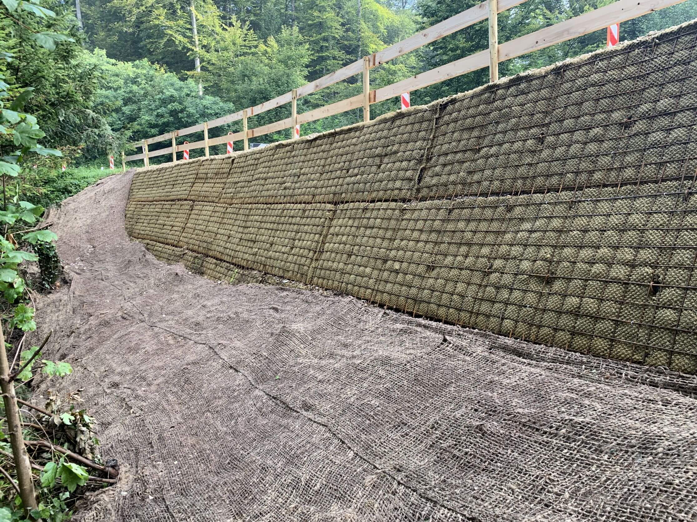 Fortunatamente, si è scoperto che il tratto pavimentato della strada non era ancora danneggiato. Tuttavia, l'argine a valle era stato dilavato per una lunghezza di circa 20 metri. Il temporale successivo avrebbe causato danni enormi alla strada. Gli esperti hanno subito concordato che la soluzione era una struttura di sostegno in terra armata SYTEC. Questa può essere costruita rapidamente ed è subito completamente caricabile. Inoltre, il paramento può essere vegetalizzato e si integra bene nel paesaggio.