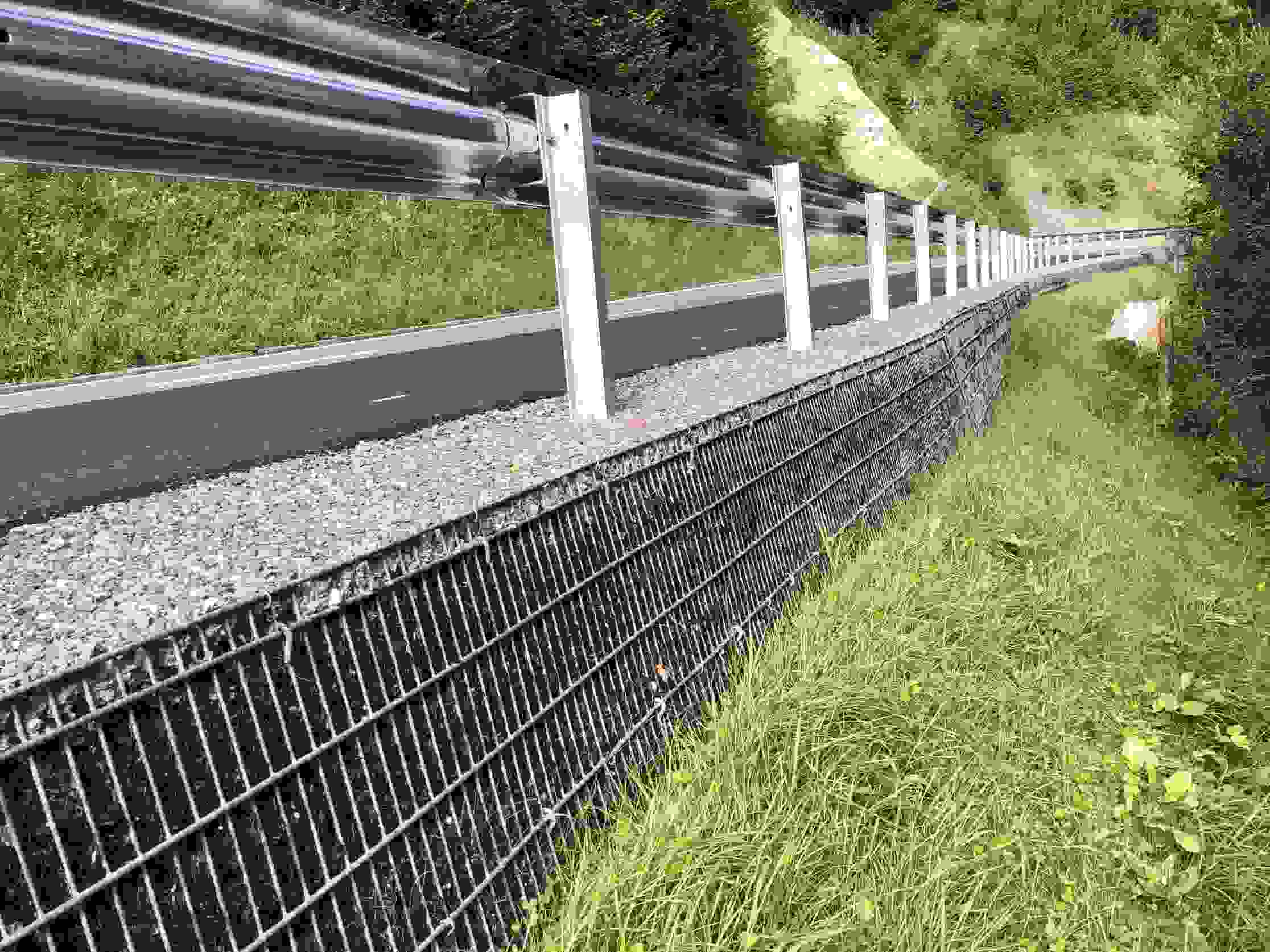 È stata cercata e trovata una soluzione durevolmente stabile, di rapida costruzione e poco costosa. La stabilizzazione della banchina BaFix S Plus è una struttura di sostegno in terra armata composta da elementi frontali in acciaio rivestiti in zinco alluminio con protezione contro l'erosione integrata e geogriglie. Come materiale di riempimento viene utilizzato il classico misto granulare per la costruzione stradale. Il sistema è adatto per altezze di costruzione fino a 1,00 m e ha un'inclinazione frontale di 80°. Il paramento della costruzione può essere rinverdito diventando quindi pressoché invisibile. Un'ulteriore geogriglia installata sul lato valle della strada funge da armatura dello strato di fondazione e aumenta significativamente la capacità portante della carreggiata e del bordo. La costruzione ha anche creato spazio per un'ulteriore striscia di banchina sul bordo della carreggiata.