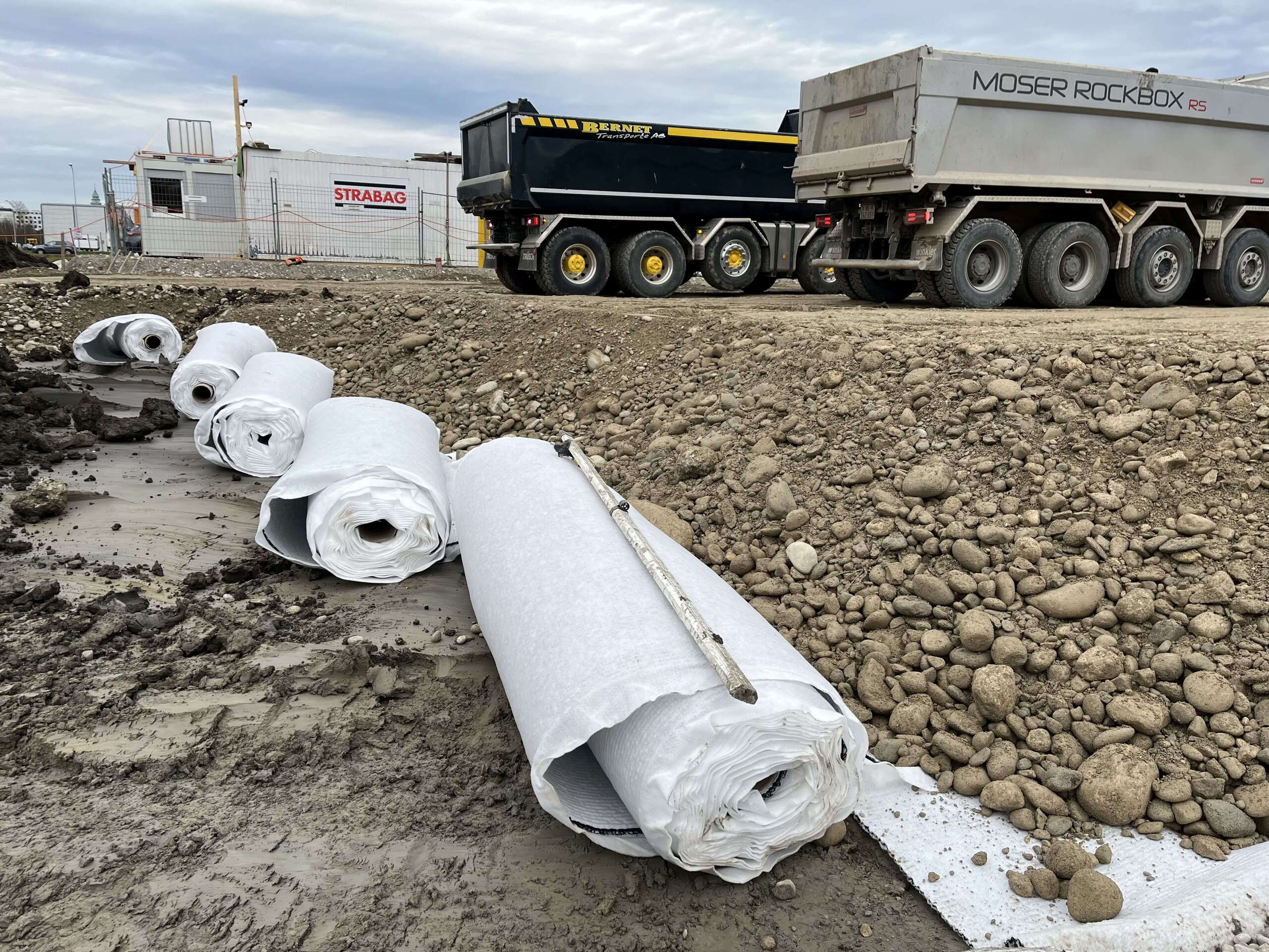 Stuoia di drenaggio superficiale sul sottofondo per drenare l'acqua di risalita. Sottosuolo con bassa capacità portante e alto contenuto d'acqua.